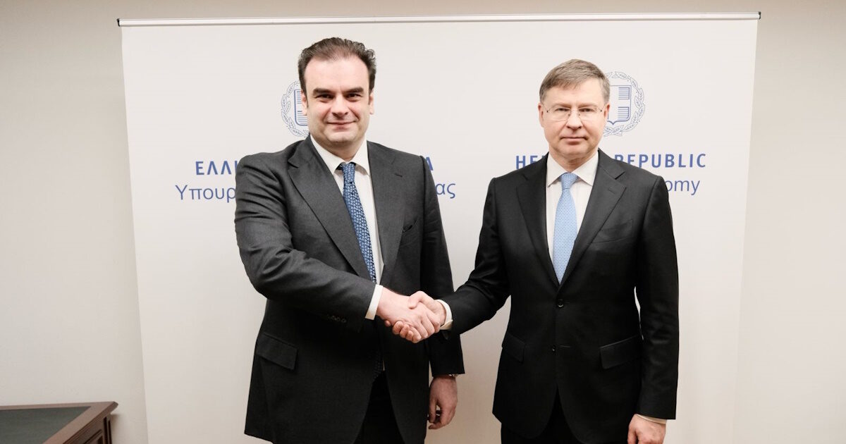 Με τον αρμόδιο επίτροπο της ΕΕ για θέματα οικονομίας, παραγωγικότητας, εφαρμογής και απλούστευσης, Βάλντις Ντομπρόβσκις, συναντήθηκαν σήμερα (23.4.2026) ο υπουργός Εθνικής Οικονομίας και Οικονομικών Κυριάκος Πιερρακάκης και η πολιτική ηγεσία του υπουργείου.